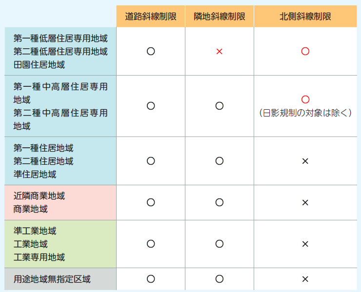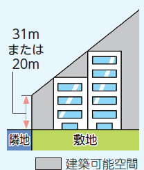 ※第一種・第二種低層住居専用地域、田園住居地域では建築物の高さが10m または12m までに制限されるので、適用されません。