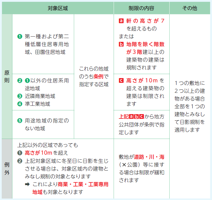 建築物より生ずる日影を周辺の土地に、一定時間おとさないようにし、日照環境を保持しようと