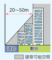 前面道路の幅員との関係で建物の高さを規制するもので対向建物の日照・採光・通風などに支障がないようにすると共に、道路の採光等をも確保することを目的とします。