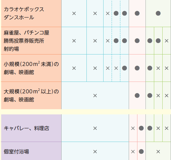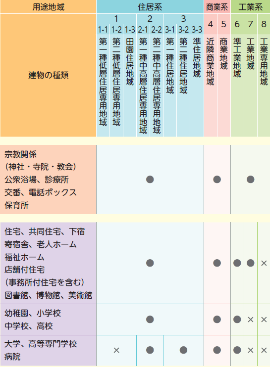 宅建 法令上の制限 建築基準法用途規制 建築基準法-用途規制 2024年11月15日 2025年10月18日 admin Facebook postはてブLINEPocketFeedly 用途地域に指定した以上、そのプランに従って建物を建築しなければならないものとしました。 敷地が複数の地域にわたる場合、敷地の過半に属する地域の用途規制が適用されます。●:自由に建築可 ×:建築には要許可 Facebook postはてブLINEPocketFeedly