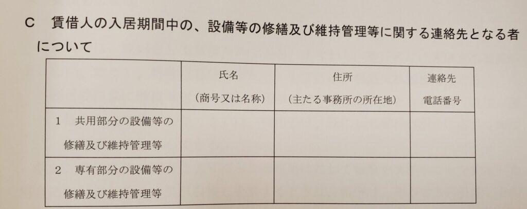 C 賃借人の入居期間中の、 設備等の修繕及び維持管理等に関する連絡先となる者 について
